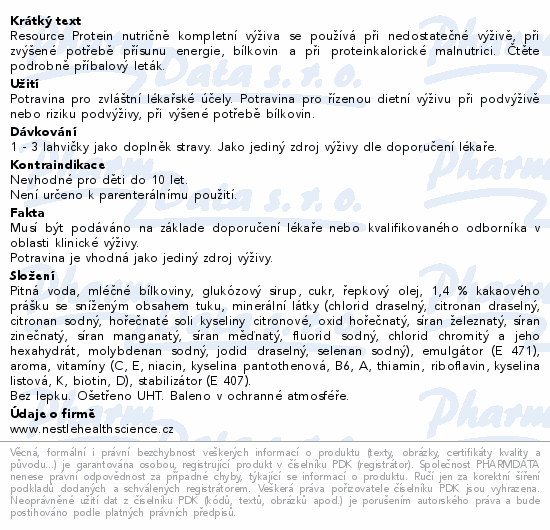Resource Protein nutričně kompletní výživa se používá při nedostatečné výživě, při zvýšené potřebě přísunu energie, bílkovin a při proteinkalorické malnutrici. Čtěte pozorně příbalový leták.