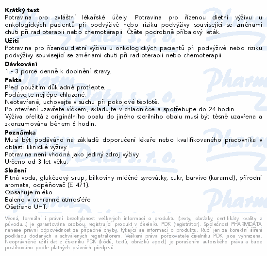 Potravina pro zvláštní lékařské účely. Potravina pro řízenou dietní výživu u onkologických pacientů při podvýživě nebo riziku podvýživy související se změnami chuti při radioterapii nebo chemoterapii. Čtěte pozorně příbalový leták.