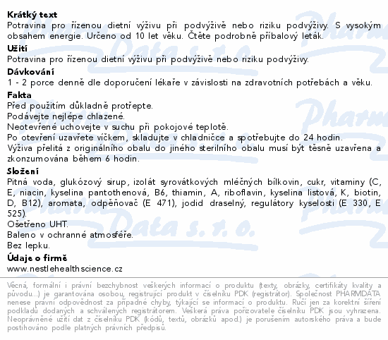 Potravina pro řízenou dietní výživu při podvýživě nebo riziku podvýživy. S vysokým obsahem energie. Určeno od 10 let věku. Čtěte pozorně příbalový leták.