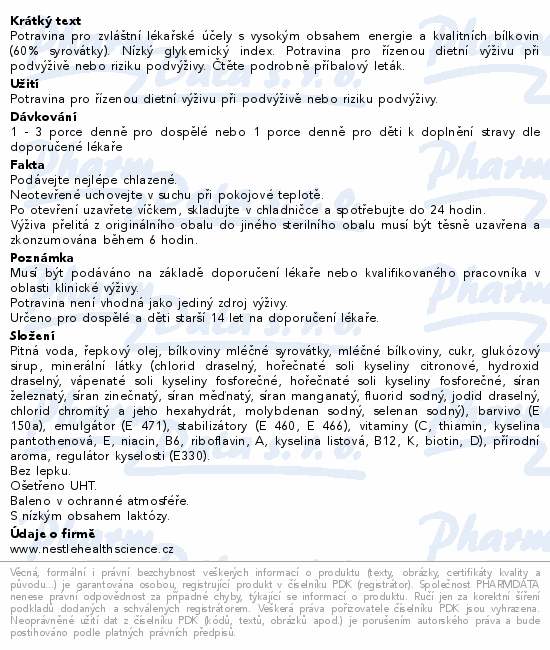 Potravina pro zvláštní lékařské účely s vysokým obsahem energie a kvalitních bílkovin (60% syrovátky). Nízký glykemický index. Potravina pro řízenou dietní výživu při podvýživě nebo riziku podvýživy. Čtěte pozorně příbalový leták.