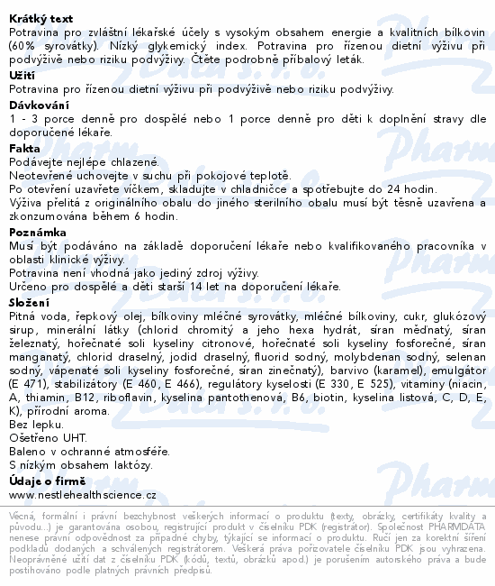 Potravina pro zvláštní lékařské účely s vysokým obsahem energie a kvalitních bílkovin (60% syrovátky). Nízký glykemický index. Potravina pro řízenou dietní výživu při podvýživě nebo riziku podvýživy. Čtěte pozorně příbalový leták.