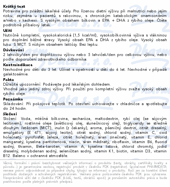 Potravina pro zvláštní lékařské účely. Vysokokalorická výživa bohatá na rybí tuk (EPA+DHA), bílkoviny, tuky (včetně MCT), obsahující vlákninu. Bez lepku a bez laktózy, s nízkým obsahem sodíku. S příchutí Ananas - Kokos. Čtěte pozorně příbalový leták.