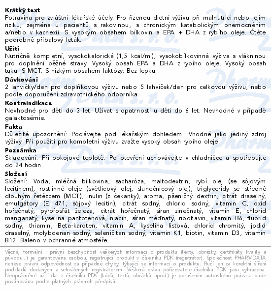 Potravina pro zvláštní lékařské účely. Vysokokalorická výživa bohatá na rybí tuk (EPA+DHA), bílkoviny, tuky (včetně MCT), obsahující vlákninu. Bez lepku a bez laktózy. Obsahující 0,34 mg coffeinu/100 ml. S příchutí Kapuučína. Čtěte pozorně příbalový leták.