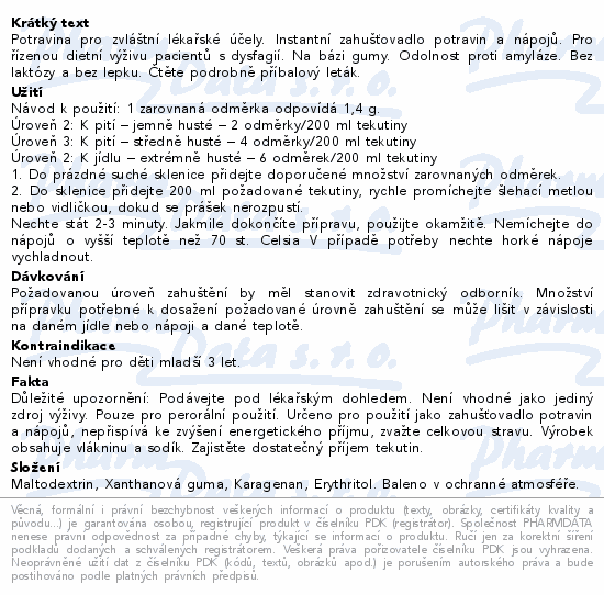 Instantní zahušťovadlo potravin a nápojů. Na bázi gumy. Odolnost proti amyláze. Jasné výsledky, bez chuti. Bez laktózy a bez lepku. Pro řízenou dietní výživu pacientů s dysfagií. Potravina pro zvláštní lékařské účely. Čtěte pozorně příbalový leták.
