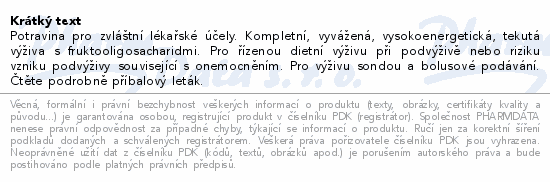 Potravina pro zvláštní lékařské účely. Kompletní, vyvážená, vysokoenergetická, tekutá výživa s fruktooligosacharidmi. Pro řízenou dietní výživu při podvýživě nebo riziku vzniku podvýživy související s onemocněním. Pro výživu sondou a bolusové podávání. Čtěte pozorně příbalový leták.