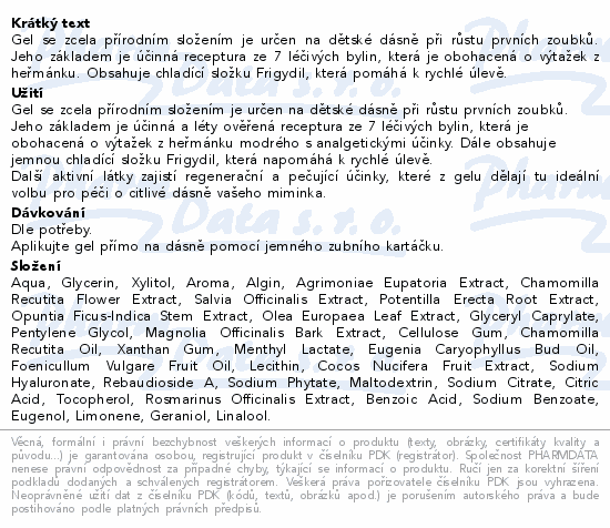 Gel se zcela přírodním složením je určen na dětské dásně při růstu prvních zoubků. Jeho základem je účinná receptura ze 7 léčivých bylin, která je obohacená o výtažek z heřmánku. Obsahuje chladící složku Frigydil, která pomáhá k rychlé úlevě.