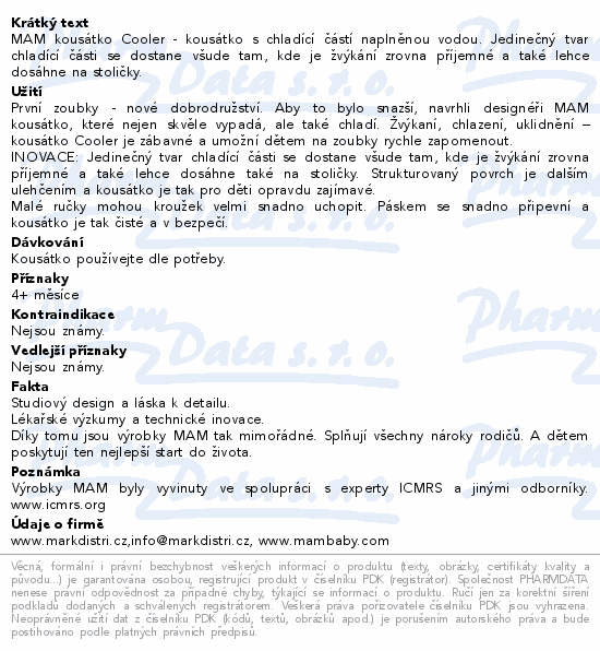 MAM kousátko Cooler - kousátko s chladící částí naplněnou vodou. Jedinečný tvar chladící části se dostane všude tam, kde je žvýkání zrovna příjemné a také lehce dosáhne na stoličky.