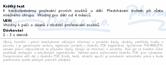 K bezbolestnému prořezání prvních zoubků u dětí. Předcházení bolesti při růstu mléčného chrupu. Vhodný pro děti od 4 měsíců.