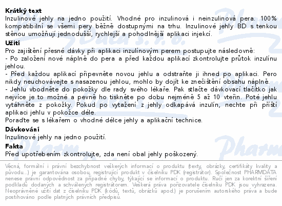 Inzulinové jehly na jedno použití. Vhodné pro inzulinová i neinzulinová pera. 100% kompatibilní se všemi pery běžně dostupnými na trhu. Inzulinové jehly BD s tenkou stěnou umožňují jednodušší, rychlejší a pohodlnější aplikaci injekcí.