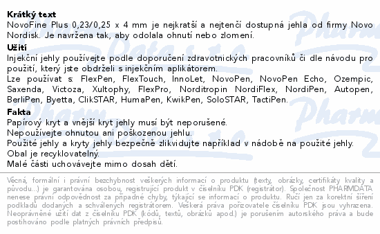 NovoFine Plus 0,23/0,25 x 4 mm je nejkratší a nejtenčí dostupná jehla od firmy Novo Nordisk. Je navržena tak, aby odolala ohnutí nebo zlomení.