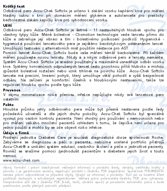Odběrové pero Accu-Chek Softclix je určeno k získání vzorku kapilární krve pro měření hladiny cukru v krvi při domácím měření glykémie a autolanceta pro prakticky bezbolestné získání kapičky krve pro vyhodnocení vzorku.
