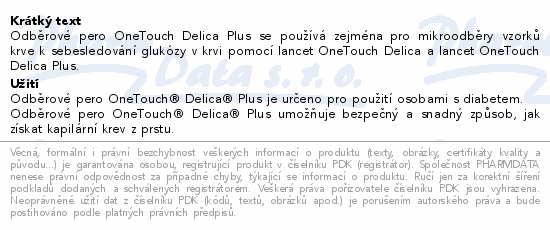 Odběrové pero OneTouch Delica Plus se používá zejména pro mikroodběry vzorků krve k sebesledování glukózy v krvi pomocí lancet OneTouch Delica a lancet OneTouch Delica Plus.