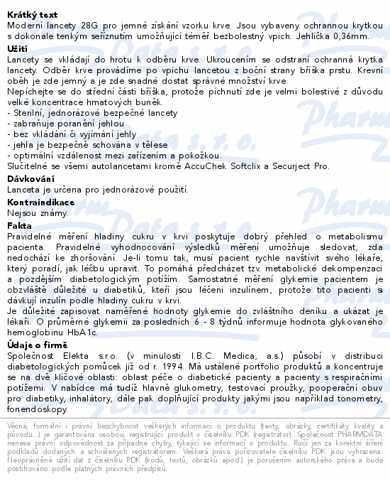 Moderní lancety 28G pro jemné získání vzorku krve. Jsou vybaveny ochrannou krytkou s dokonale tenkým seříznutím umožňující téměř bezbolestný vpich. Jehlička 0,36mm.
