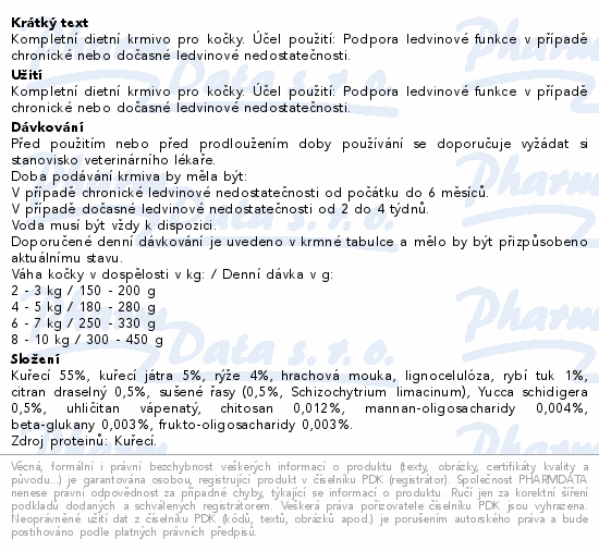 Kompletní dietní krmivo pro kočky. Účel použití: Podpora ledvinové funkce v případě chronické nebo dočasné ledvinové nedostatečnosti.