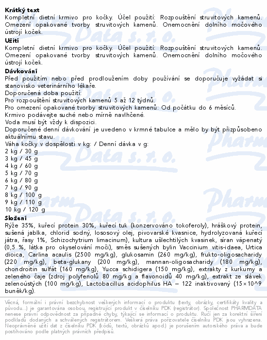 Kompletní dietní krmivo pro kočky. Účel použití: Rozpouštění struvitových kamenů. Omezení opakované tvorby struvitových kamenů. Onemocnění dolního močového ústrojí koček.