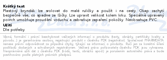 Plastový bryndák lze srolovat do malé ruličky a použít i na cesty. Okap zachytí bezpečně vše, co spadne ze lžičky. Lze upravit velikost kolem krku. Speciálně upravený povrch umožňuje proudění vzduchu a zabraňuje zapaření pokožky. Neobsahuje PVC.