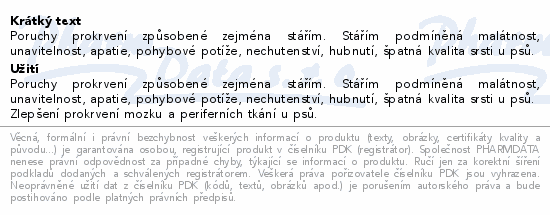 Poruchy prokrvení způsobené zejména stářím. Stářím podmíněná malátnost, unavitelnost, apatie, pohybové potíže, nechutenství, hubnutí, špatná kvalita srsti u psů.