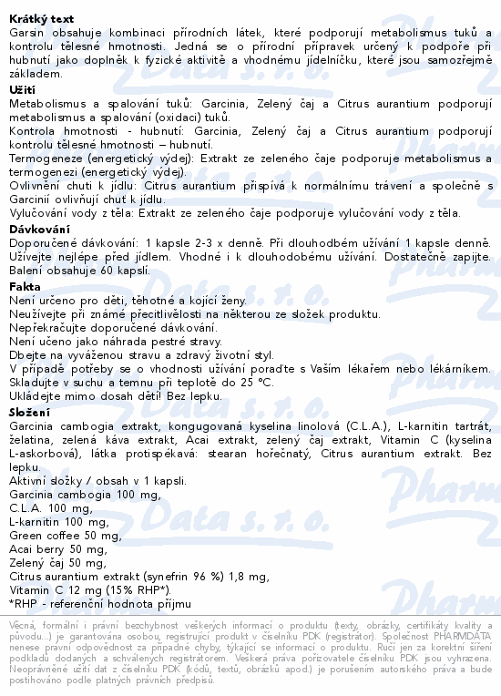 Garsin obsahuje kombinaci přírodních látek, které podporují metabolismus tuků a kontrolu tělesné hmotnosti. Jedná se o přírodní přípravek určený k podpoře při hubnutí jako doplněk k fyzické aktivitě a vhodnému jídelníčku, které jsou samozřejmě základem.