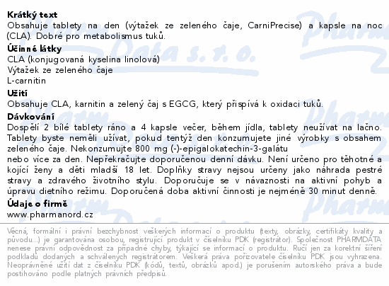 Obsahuje tablety na den (výtažek ze zeleného čaje, CarniPrecise) a kapsle na noc (CLA). Dobré pro metabolismus tuků.