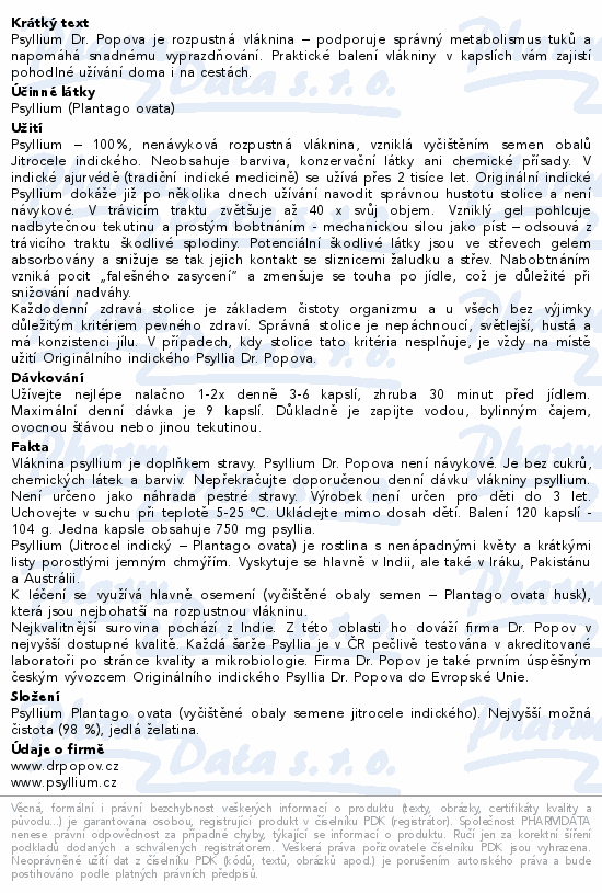 Psyllium Dr. Popova je rozpustná vláknina – podporuje správný metabolismus tuků a napomáhá snadnému vyprazdňování. Praktické balení vlákniny v kapslích vám zajistí pohodlné užívání doma i na cestách.