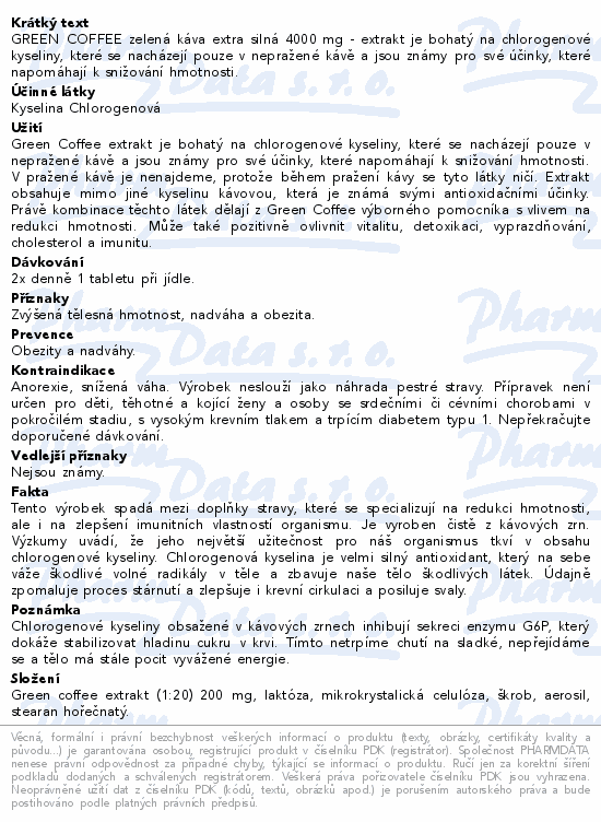 GREEN COFFEE zelená káva extra silná 4000 mg - extrakt je bohatý na chlorogenové kyseliny, které se nacházejí pouze v nepražené kávě a jsou známy pro své účinky, které napomáhají k snižování hmotnosti.