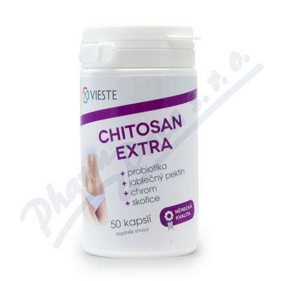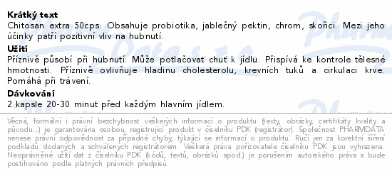 Chitosan extra 50cps. Obsahuje probiotika, jablečný pektin, chrom, skořici. Mezi jeho účinky patří pozitivní vliv na hubnutí.