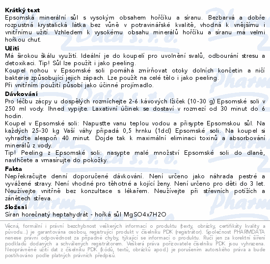 Epsomská minerální sůl s vysokým obsahem hořčíku a síranu. Bezbarvá a dobře rozpustná krystalická látka bez vůně v potravinářské kvalitě, vhodná k vnějšímu i vnitřnímu užití. Vzhledem k vysokému obsahu minerálů hořčíku a síranu má velmi hořkou chuť.