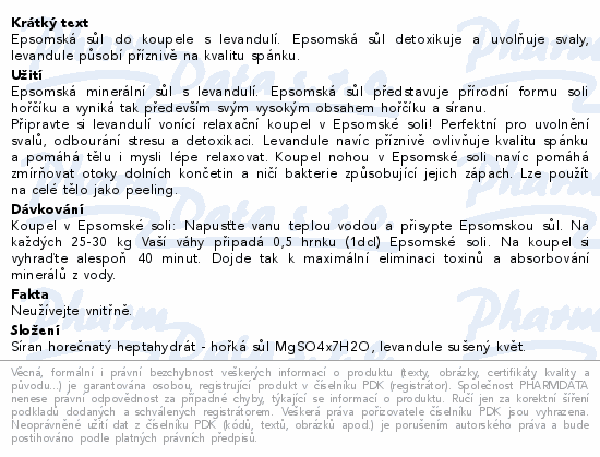 Koupel s epsomskou solí přispívá k pocitu odpočinku, osvěžuje pokožku a pomáhá uvolnit napětí svalů. Díky přidané levandulové složce má navíc příjemný aromaterapeutický efekt, který podporuje relaxaci, harmonizaci a navozuje klidnou atmosféru vhodnou i před spaním.