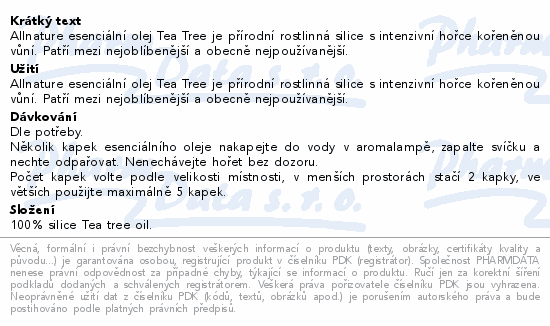 Allnature esenciální olej Tea Tree je přírodní rostlinná silice s intenzivní hořce kořeněnou vůní. Patří mezi nejoblíbenější a obecně nejpoužívanější.