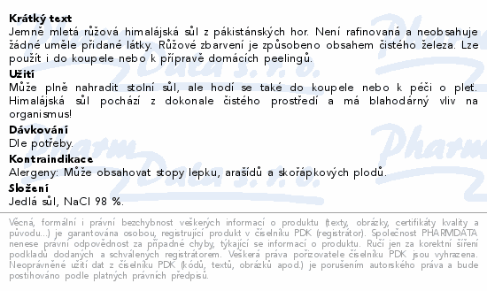 Jemně mletá růžová himalájská sůl z pákistánských hor. Není rafinovaná a neobsahuje žádné uměle přidané látky. Růžové zbarvení je způsobeno obsahem čistého železa. Lze použít i do koupele nebo k přípravě domácích peelingů.