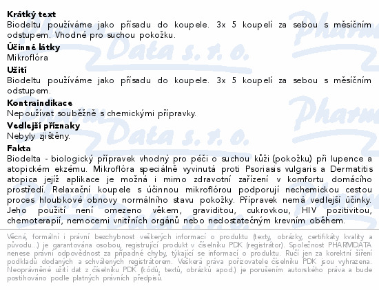 Biodeltu používáme jako přísadu do koupele. 3x 5 koupelí za sebou s měsíčním odstupem. Vhodné pro suchou pokožku.