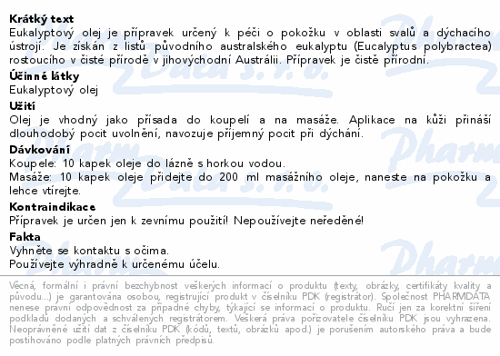 Eukalyptový olej je přípravek určený k péči o pokožku v oblasti svalů a dýchacího ústrojí. Je získán z listů původního australského eukalyptu (Eucalyptus polybractea) rostoucího v čisté přírodě v jihovýchodní Austrálii. Přípravek je čistě přírodní.
