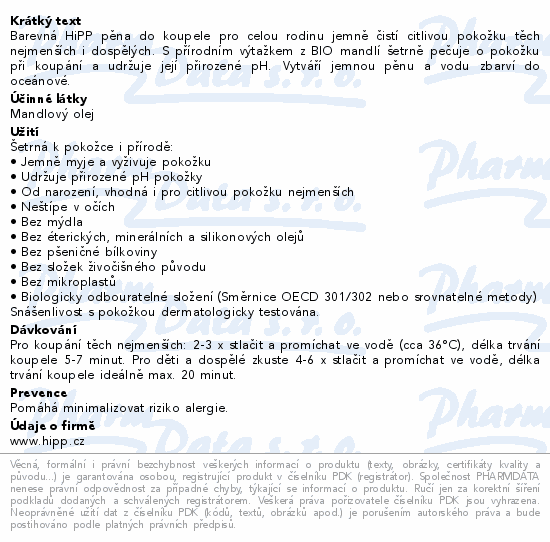 Barevná HiPP pěna do koupele pro celou rodinu jemně čistí citlivou pokožku těch nejmenších i dospělých. S přírodním výtažkem z BIO mandlí šetrně pečuje o pokožku při koupání a udržuje její přirozené pH. Vytváří jemnou pěnu a vodu zbarví do oceánové.