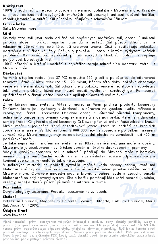 KAWAR Koupelová sůl z Mrtvého moře je přírodní produkt bohatý na minerální látky, které přispívají k péči o pokožku a uvolnění těla. Sůl z Mrtvého moře je ceněná pro vysoký obsah hořčíku, draslíku, sodíku a dalších minerálů, které podporují přirozenou regeneraci pokožky, její hydrataci a jemnost.