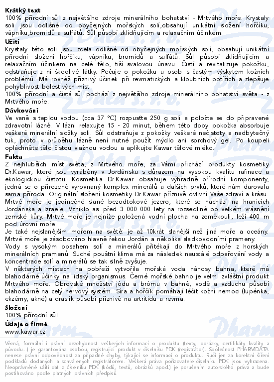 100% přírodní sůl z největšího zdroje minerálního bohatství - Mrtvého moře. Krystaly soli jsou odlišné od obyčejných mořských solí,obsahují unikátní složení hořčíku, vápníku,bromidů a sulfátů. Sůl působí zklidňujícím a relaxačním účinkem.