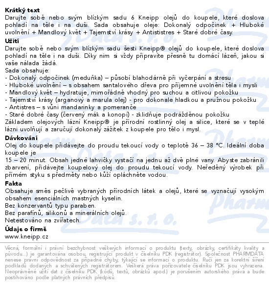 Darujte sobě nebo svým blízkým sadu 6 Kneipp olejů do koupele, které doslova pohladí na těle i na duši. Sada obsahuje oleje: Dokonalý odpočinek + Hluboké uvolnění + Mandlový květ + Tajemství krásy + Antististres + Staré dobré časy.