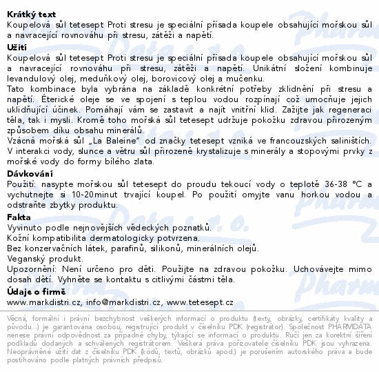 Koupelová sůl tetesept Proti stresu je speciální přísada koupele obsahující mořskou sůl a navracející rovnováhu při stresu, zátěži a napětí.