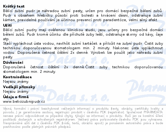 Bělící zubní pudr je náhradou zubní pasty, určen pro domácí bezpečné bělení zubů. Pudr s obsahem hřebíčku působí proti bolesti a krvácení dásní, odstraňuje zubní kámen, pravidelné používání je účinnou prevencí proti paradentóze, velmi silný efekt.