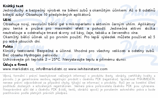 Jednoduchý a bezpečný výrobek na bělení zubů s okamžitým účinkem. Až o 8 odstínů bělejší zuby! Obsahuje 10 předplněných aplikátorů.