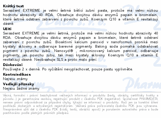 Swissdent EXTREME je velmi šetrná bělící zubní pasta, protože má velmi nízkou hodnotu abrazivity 40 RDA. Obsahuje dvojitou dávku enzymů papain a bromelain, které šetrně odstraní zabarvení z povrchu zubů. Koenzym Q10 a vitamín E revitalizují dásně.