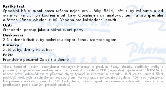 Speciální bělící zubní pasta určená nejen pro kuřáky. Bělící, leští zuby zažloutlé a od skvrn vznikajících při kouření a pití kávy. Obsahuje i dimanatovou zeminu pro speciální a šetrné účinné vybělení zubů. Vhodná pro každodenní použití.