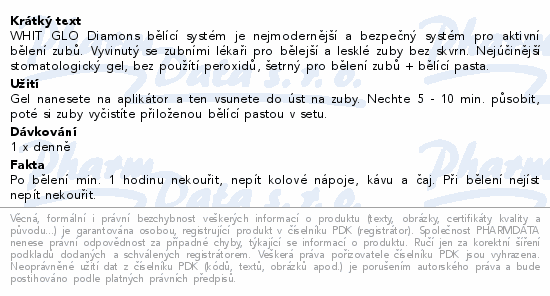 WHIT GLO Diamons bělící systém je nejmodernější a bezpečný systém pro aktivní bělení zubů. Vyvinutý se zubními lékaři pro bělejší a lesklé zuby bez skvrn. Nejúčinější stomatologický gel, bez použítí peroxidů, šetrný pro bělení zubů + bělící pasta.