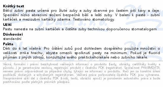 Bělící zubní pasta určená pro žluté zuby a zuby zbarvné po častém pití kávy a čaje. Speciální nízko abrazivní složení bezpečně bělí a leští zuby. V balení k pastě - zubní kartáček a mezizubní kartáčky zdarma. Testováno stomatology.