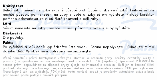 Bělící zubní sérum na zuby aktivně působí proti žlutému zbarvení zubů. Fialové sérum nechte působit po nanesení na zuby a poté si zuby sérem vyčistěte. Fialový korektor pomahá odstraňovat ze zubů žluté zbarvení a bělí zuby.