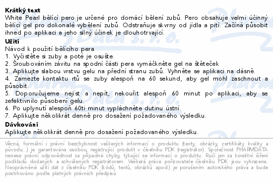 White Pearl bělící pero je určené pro domácí bělení zubů. Pero obsahuje velmi účinný bělící gel pro dokonalé vybělení zubů. Odstraňuje skvrny od jídla a pití. Začíná působit ihned po aplikaci a jeho silný účinek je dlouhotrvající.