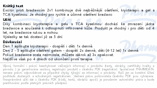 Excilor proti bradavicím 2v1 kombinuje dvě nejběžnější ošetření, kryoterapii a gel s TCA kyselinou. Je vhodný pro rychlé a účinné ošetření bradavic