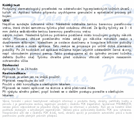 Podpůrný dermatologický prostředek na odstraňování hyperplastických kožních útvarů - kuřích ok. Aplikací tohoto přípravku urychlujeme granulační a epitelizační procesy při hojení.