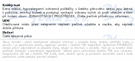 Extra měkké, hypoalergenní ochranné polštářky z čistého pěnového latexu jsou šetrné k pokožce, zmírňují bolesti a poskytují vynikající ochranu kuřích ok proti otlakům a tření při nošení obuvi. ZDRAVOTNICKÝ PROSTŘEDEK. Čtěte pečlivě příbalovou informaci.