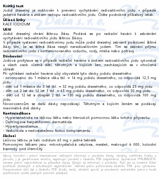 Jodid draselný je indikován k prevenci vychytávání radioaktivního jódu v případě jaderné havárie s únikem isotopu radioaktivního jódu. Čtěte pozorně příbalový leták.
