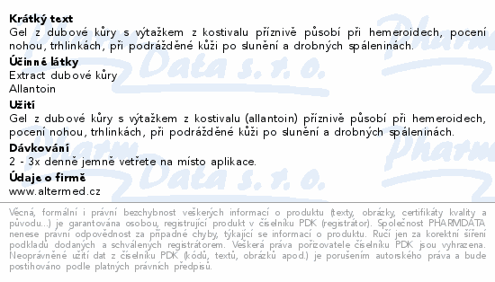 Přípravek určený k zevní péči o podrážděnou a citlivou pokožku. Obsahuje extrakt z dubové kůry a allantoin. Gel je vhodný při péči o pokožku postiženou hemoroidy, opruzeninami, drobnými oděrkami nebo záněty. Používá se i na podrážděnou pokožku po slunění nebo při nadměrném pocení nohou. Je určen pouze k zevnímu použití.